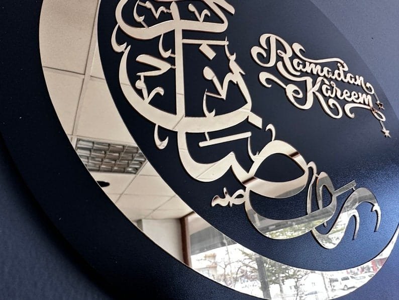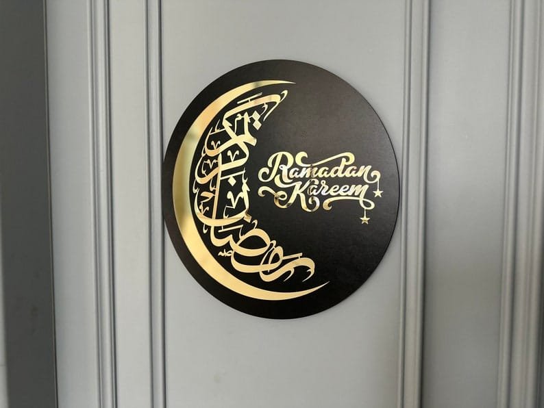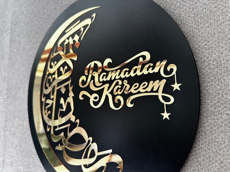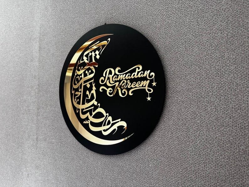 Acrylic “Ramadan Kareem” wall decor can make a modern and elegant statement for the holy month. Acrylic art typically has a sleek, contemporary look with vibrant colors and sharp details that bring depth to the design. This type of decor can be more durable and easy to clean compared to traditional prints or canvas, making it a practical yet stylish choice for home or office spaces.