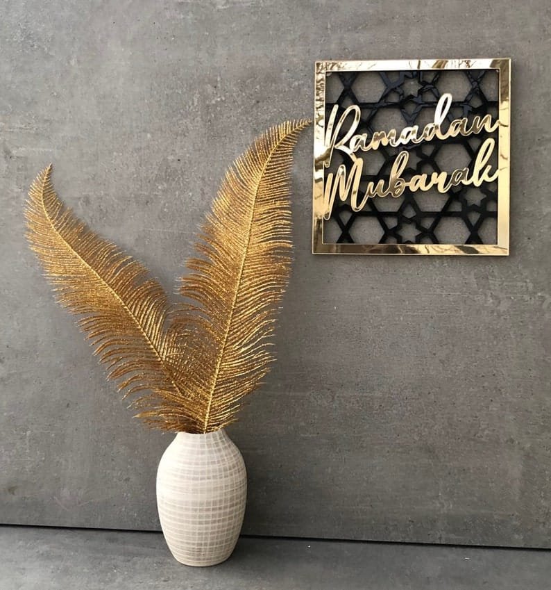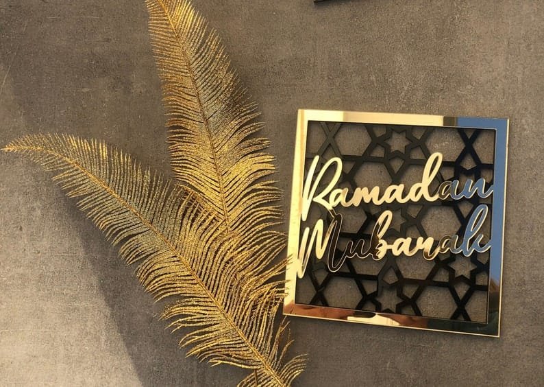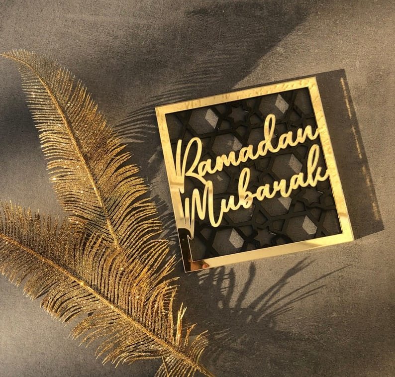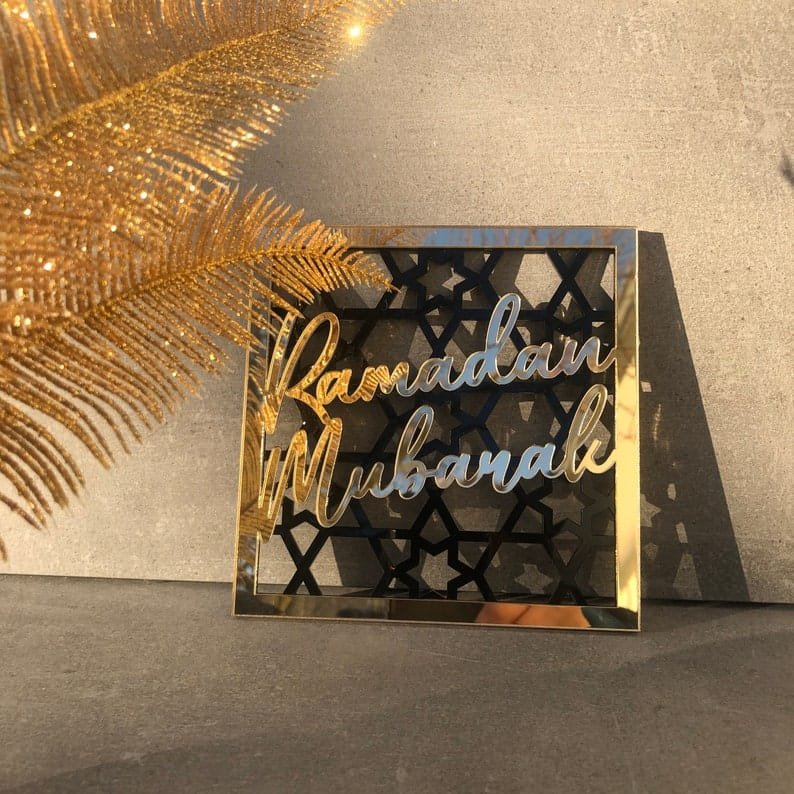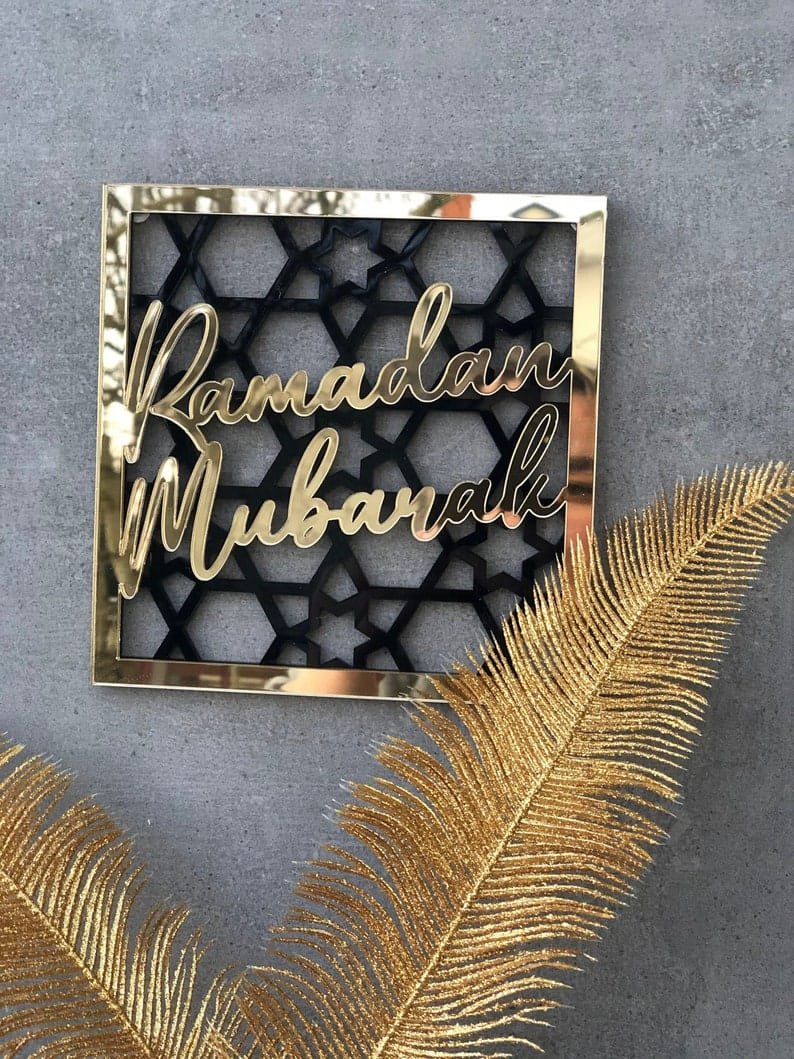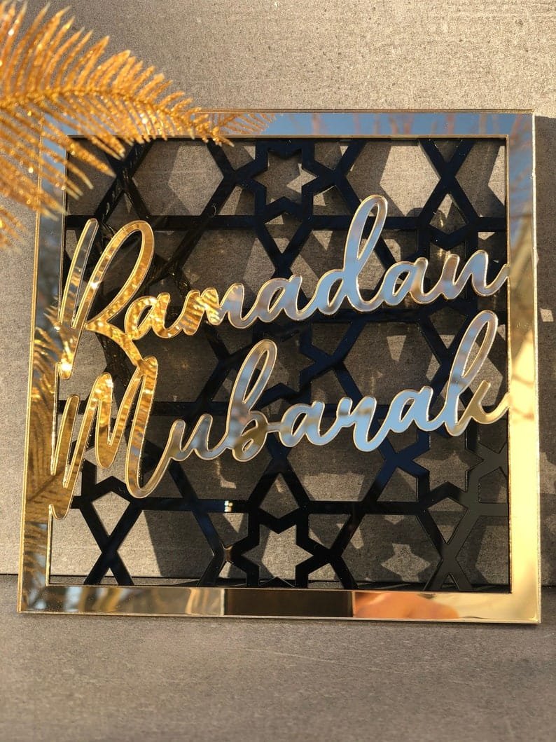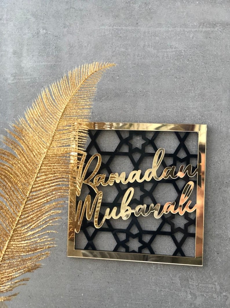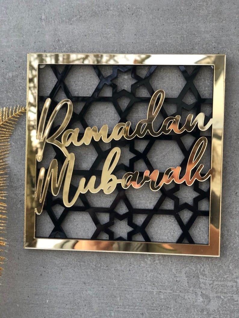 - Arabic Calligraphy: Elegant script of Ramadan Mubarak or Eid Mubarak in gold, silver, or black on a clear, frosted, or mirrored acrylic background.